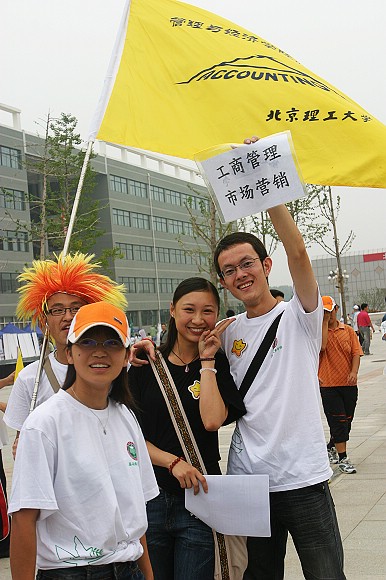 迎新车辆停下的场地附近,各学院的学生都想尽了办法吸引本院的新生,这是管理与经济学院的学生在迎接新同学的到来。