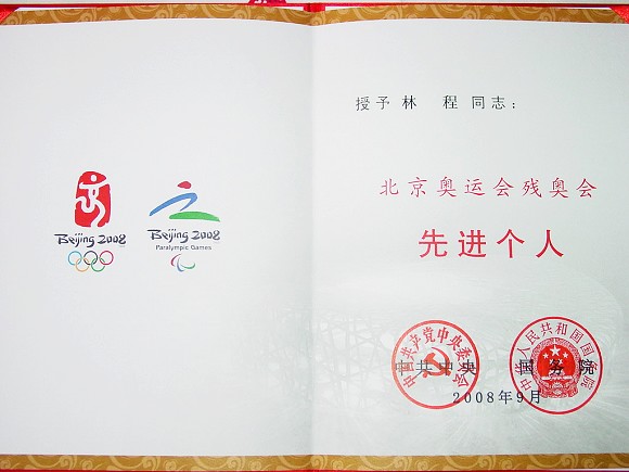 我校体育馆团队和林程教授分别荣获北京奥运会残奥会先进集体、先进个人
