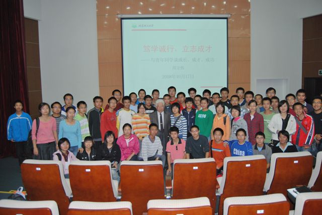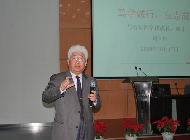 周院士的报告分为五个部分:“青年时期要立志”、“成功的秘诀是笃学”、“诚行需要人文积累”、“学习要讲究方法”、“成才要与祖国的需要结合”。