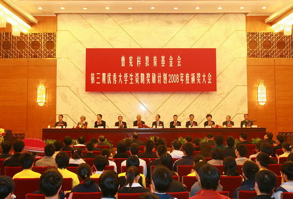 11月6日下午,曾宪梓教育基金会第三期“优秀大学生资助奖励计划”2008年度颁奖大会在人民大会堂举行。全国人大常委会副委员长韩启德、教育部副部长袁贵仁、中央统战部副部长楼志豪、国务院港澳办副主任华建、香港金利来集团有限公司董事局主席曾宪梓、曾宪梓教育基金会理事长曾智明以及获得曾宪梓载人航天基金奖励的神州六号航天员费俊龙、聂海胜等出席了颁奖会并为本届获奖大学生代表颁奖。我校李和章副校长和14名获奖学生代表参加了颁奖仪式。