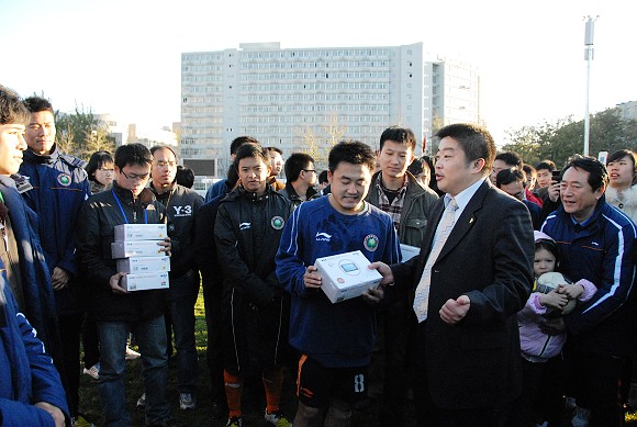 球队的名誉领队、冠名赞助商“爱国者”总裁冯军先生亲自到现场观看了这场关键性的比赛,并在比赛结束后,向队员赠送了最新研发的移动电视F968TV以资鼓励,他表示:之所以要赠送公司的最新产品F968TV,主要是希望队员们可以利用这个产品的特点,随时随地关注体育比赛,新闻资讯。无论是在宿舍里,还是大街上都可以接收到清晰的数字电视信号。同时,爱国者大学生队是一支作风顽强的队伍,是自强不息和团队精神的具体体现,作为一支由大学生组建起来的年轻球队,在中甲职业赛场上能够取得这样的成绩,是值得骄傲的,爱国者将继续支持这支学生军在绿茵场上实现他们的梦想。