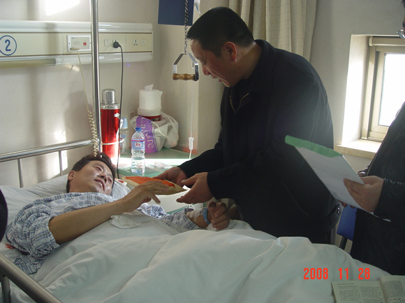 11月28日下午,后勤集团党委书记巫后新、工会主席姜金凤、工会副主席宋希博、办公室主任李秋香、物业中心副主任聂正喜、高建利再次前往医院,将这笔爱心捐款送至许七四病床前。集体的温暖、同志们的关爱,使这条昔日的硬汉热泪盈眶,我们衷心的希望许七四同志能够勇敢的面对这次人生的挫折,努力进行康复治疗,重新燃起生活的信心。寒山碧水,惟情不老,萧萧故垒,惟爱永生。