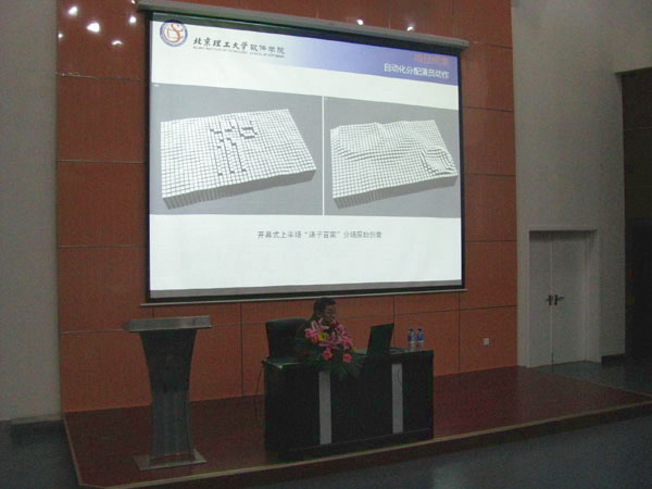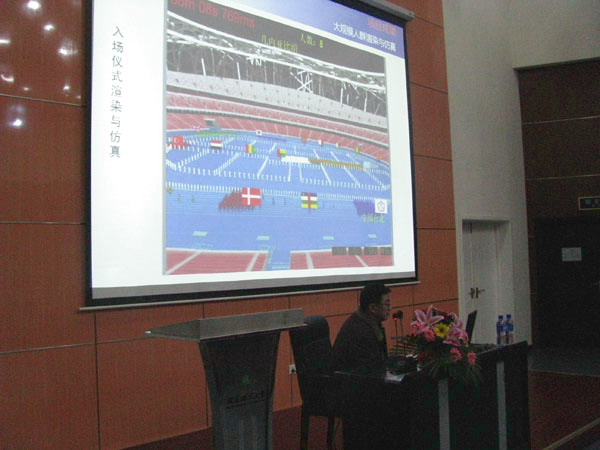 随后,丁教授又分别介绍了科技奥运概述、数字表演交叉学科、项目背景、项目成果和后续开发和成果转化。在此次奥运活动中我校共承担了十四项项目,内容从场馆建设、信息服务到文化创意、安全保障等,而全景式智能仿真编排系统更是为此次奥运会开闭幕式大型文艺活动的成功举办立下了汗马功劳。在汇报中丁教授详细介绍了与之相关的各项技术,包括技术基础、建模、支撑技术及应用技术,提出这项技术将有可观的前景,除可帮助编导节省资源外,还可用于动画影视、军事仿真、游戏制作甚至是城市管理中。最后丁教授以“仿真帮助我们实现梦想”结束了这次讲座。