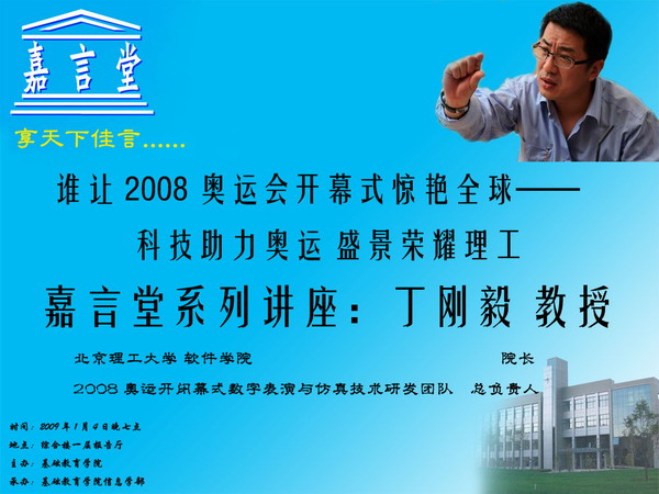 2009年1月4日晚,在良乡校区综合楼报告厅内,由金年会jinnianhuicom基础教育学院主办、信息学部承办的“嘉言堂系列讲座”之“丁刚毅教授畅谈奥运开闭幕式背后的科技故事”如期举行。来到讲座现场的嘉宾有基础教育学院副院长杨刚老师、信息学部副主任赵昊老师、信息学部团总支书记刘希凌老师以及信息学部07级、08级全体辅导员老师等。