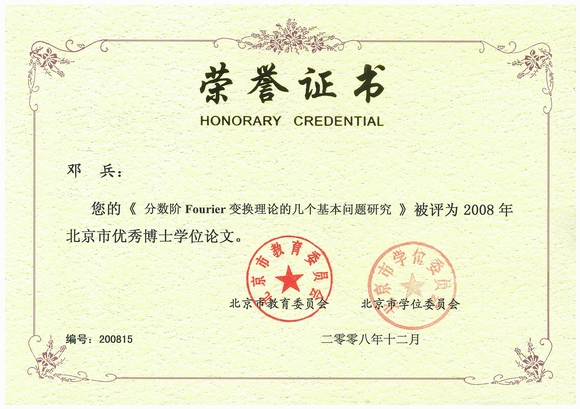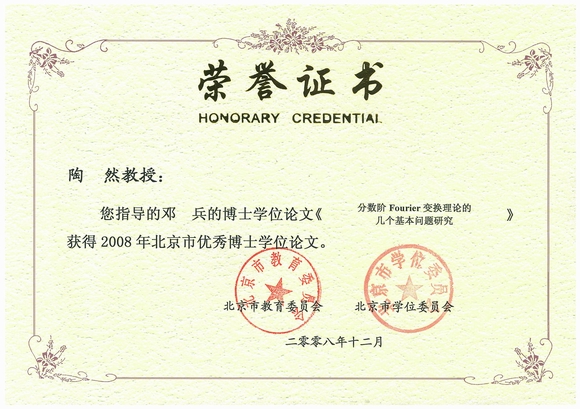 为进一步加强高层次创新人才的培养,提高研究生教育特别是博士生教育质量,北京市教委于2008年开展了“北京市首届优秀博士学位论文”评选工作,经过学科评议组评审、评选专家委员会会议评审两个阶段的评选,我校邓兵同学的博士学位论文《分数阶Fourier变换理论的几个基本问题研究》被评为2008年北京市优秀博士学位论文,其导师陶然教授获北京市优秀博士学位论文指导教师科技项目50万元经费资助。