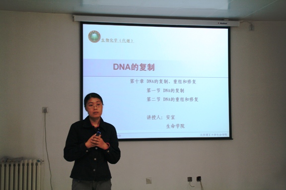 生命学院安宜老师经过校内选拔,将代表我校参加北京高校第六届青年教师教学基本功比赛,为了更好的参加比赛,展示学校学院教学工作水平,我院高度重视本次比赛的备战工作,不仅为参赛教师创造了良好的环境,还积极联系,帮助促进老师提高水平,本次模拟课堂学院还组织了部分学生参与,为老师教学比赛作品建言献策。