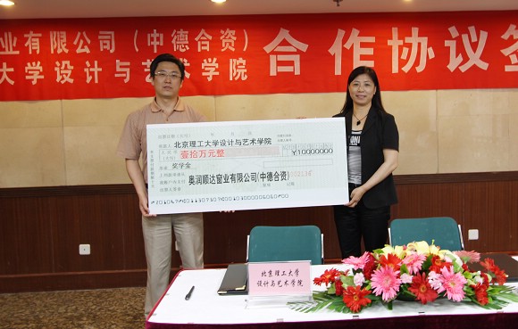 学工处处长刘影秋代表学校与奥润顺达窗业有限公司(中德合资)副总经理宋丽波交接“奥润顺达奖学金”支票(10万元/年)。学工处处长刘影秋表示,校企合作、产研结合是当代地方企业经济发展的主流,同也是学校的科研成果转化为实际产品的主要平台,希望双方加强合作,在互惠互利的合作方式中获得最大的收益。