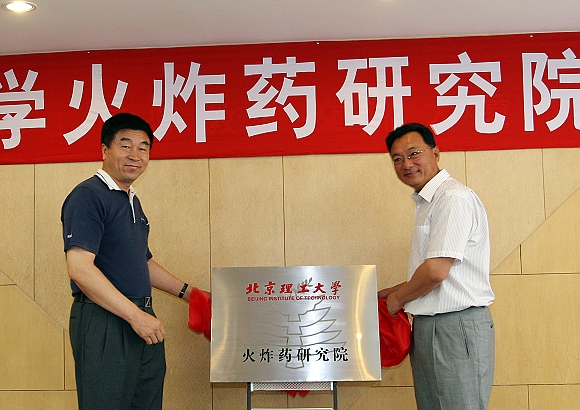 兵器工业集团第三事业部主任王成国与金年会jinnianhuicom党委书记郭大成为金年会jinnianhuicom火炸药研究院揭牌。