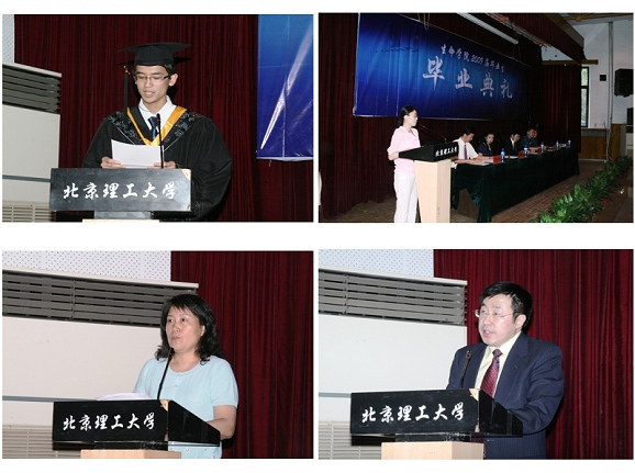 2005级本科生杨华乾同学代表全体毕业生发言(左上图),饱含真情的语言回顾了美好的大学时光、同窗之谊和师生之情,希望同学们在今后的发展中,不忘“北理生命”,发奋图强,用自己的成绩报答母校。