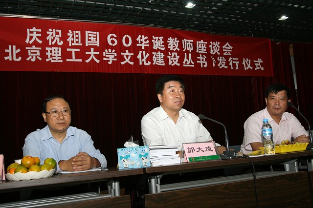郭大成首先代表学校党委和行政向各位教师代表表达了节日的问候,指出我校的发展成就与祖国发展同步,主要集中于建国60年,不仅人才培养、科学研究、社会服务等各方面都取得了好的成就,而且培养出的很多学生为经济社会建设和国防科技工业发展作出了卓越贡献,成为北理工的骄傲。