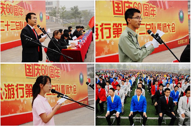 之后,大会首先由游行方阵行进指挥王晓庸介绍国庆群众游行相关工作,王晓庸从集结疏散、安全保障、应急事件处理等方面对10月1日的工作进行了安排和布置,以确保每一个参演师生能够熟悉流程、明确职责,确保游行活动万无一失。随后,参演人员代表F大队大队长徐靖宇和工作人员代表保障联络处韩姗杉分别发言,他们对过去两个多月来的训练和保障工作进行了回顾,代表全体参演人员表达了对祖国60华诞的深情祝福,并庄严承诺:我们一定会以最佳的状态和最高的水平来完成这个光荣、神圣的使命,请祖国母亲对您的儿女们放心!