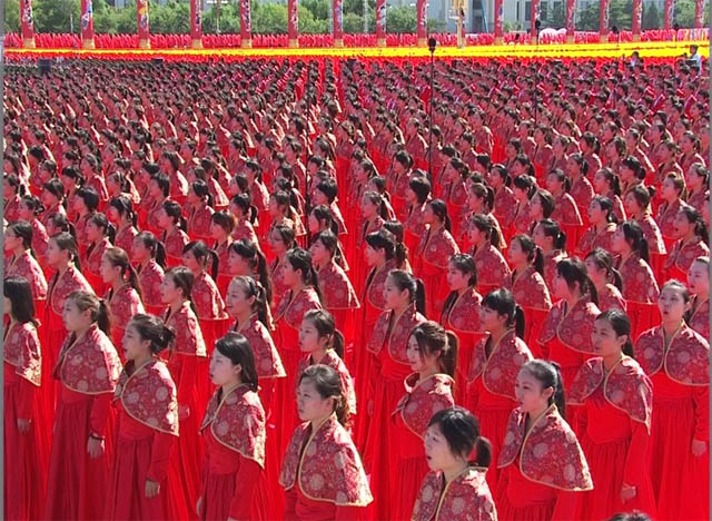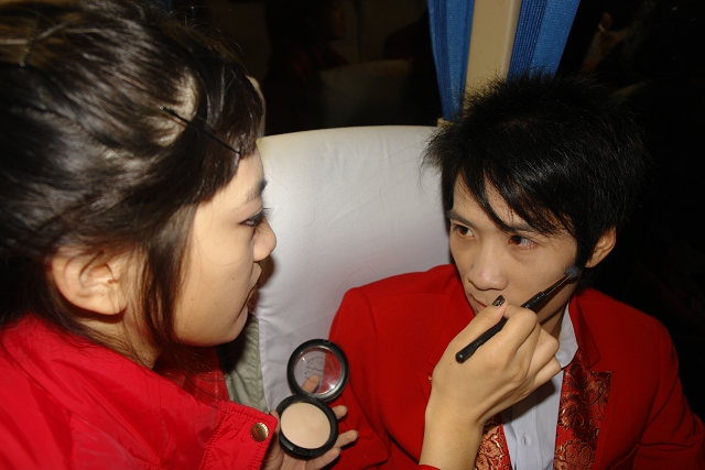 为了达到最佳表演效果,在去往广场的路上,许多生平从未化过妆的男同学在女同学的帮助下迅速地面貌一新。