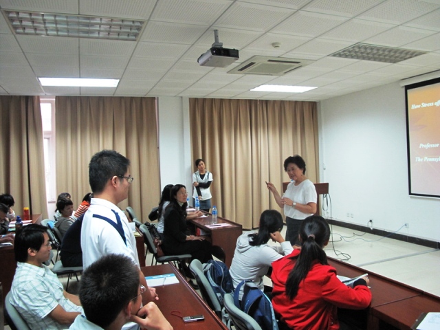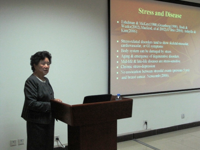 生命学院副院长唐晓英老师亲临讲座现场,并致欢迎词,代表生命学院对查教授的来表示热烈欢迎,希望通过学术交流为之后的相关合作奠定基础。本次讲座分为Prior work、Theory、Surveys、Procedure、Analyses、Results、Discussion and Conclusion七部分,查露茜教授在讲座中全面而细致的阐述了她在心理压力与疾病的关系,老年人群健康问题等方面所做的研究工作。她所建立的Dimensions of Health Status模型,全面考虑到了家庭、文化等因素的影响,比前人所做的工作更加完善和合理。