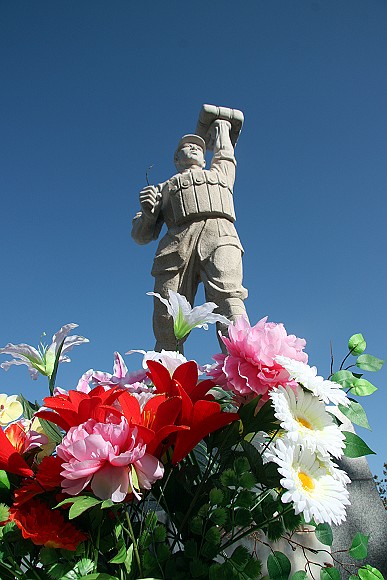 在青松翠柏的掩映下,董存瑞烈士舍身炸碉堡的塑像显得更加高大英武。考察团成员深怀崇敬之情向烈士塑像敬献花篮,并行三鞠躬,表达敬意,深切缅怀革命先烈。