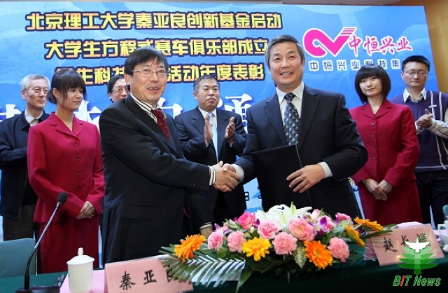 赵长禄代表学校与秦亚良签署了秦亚良创新基金的设立协议。赵长禄向秦亚良先生颁发了捐赠证书。秦亚良说,感谢北理工,回报母校,这是他一直以来的心愿。2006年,秦亚良曾在北理工设立了宿舍奖学金,来倡导优良的学风和整洁的生活作风,是希望能对提高学生积极上进的热情进献一点绵薄之力。今天秦亚良决定在北理工扩大支持力度,以每年30万来支持大学生科技创新活动,也展示了中恒兴业继续坚持回报社会、回报教育的理念。“感谢北理工,不仅因为她赋予了我风华正茂时期的回忆,教会了我创造财富的专业知识。更因为她让我们明白什么是我们需要的优秀素质,并且给了我们机会和条件,引导我们去学得这些素质。”秦亚良说。