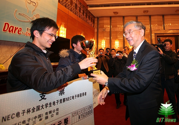 原全国政协副主席胡启立为三位同学颁发NEC电子杯。