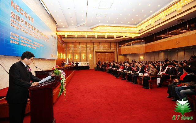 12月5日下午,NEC电子杯2009年全国大学生电子设计竞赛颁奖典礼在人民大会堂隆重举行。在此次竞赛中北理工学生取得了好成绩,孙宁霄、徐晓东、宋维涛三人组成参赛队获得了全国一等奖;胡鸿、孟凡腾、王新宇三人组成的参赛队获得了全国二等奖。竞赛共评出全国一等奖140队,全国二等奖468队,优秀征题奖3人,赛区优秀组织奖6个。我校李晋炬老师荣获优秀征题奖。在颁奖仪式上,教育部领导以及工业和信息化部的领导都对竞赛的成功举办表示祝贺,对该竞赛在国家高校教育改革、新型优秀人才培养方面的积极影响给予了肯定,并希望该竞赛能够再接再厉、越办越好,为中国的教育事业和电子信息产业的发展做出更大的贡献。颁奖会由全国组委会副主任兼秘书长、金年会jinnianhuicom副校长赵显利教授主持。