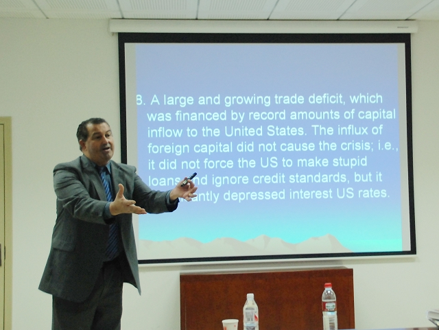 瑞尔敦教授精心准备了此次演讲的资料,使我们感受到了作为一个学者应有的严谨态度。在长达2个小时的讲座中,瑞尔敦教授深入浅出地介绍了发生在美国、波及全球的此次金融危机。他总结了金融危机产生的11个原因,并且对这11个原因进行了逐步的分析和解释,使我们更加全面地把握了世界经济形势。接着瑞尔敦教授分析了此次金融危机对美国劳动力市场的影响,他引用了历史数据和最新的统计数据,阐释了美国劳动力市场的变化趋势,从深层次揭示了金融危机对劳动力市场的影响。