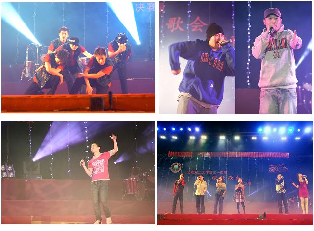 在国内新锐hip-hop组合X-power火爆的舞蹈中,比赛正式拉开了帷幕。14位选手依次演唱了自己的参赛曲目。他们的表演各具风格,从同学们喜闻乐见的POP、让人热血沸腾的ROCK、极具风格的JAZZ,到颇具难度的美声和民族唱法应有尽有。充分展现了北理工学子独特的个人风采和不俗的音乐造诣。值得一提的是,在选手表演过程中,还特意请到了往届的一些优秀歌手为观众献上他们的歌曲和祝福。校友刘烨的新歌《我的名字叫感恩》,深深地打动了现场的观众。由往届深秋歌会获奖选手组成,享誉北理的MELODY组合的深情献唱,更是让每位观众都沉浸其中。本届歌会保留了传统的PK环节,但又增加了新的亮点。除了6名晋级选手自由结合成三组,进行组内PK外,在第一轮PK中脱颖而出的三名选手还与往届的优秀歌手结组对唱,进行组间PK。特邀嘉宾爽子的登场,更是掀起了歌会的高潮。