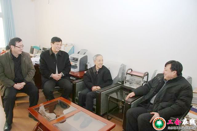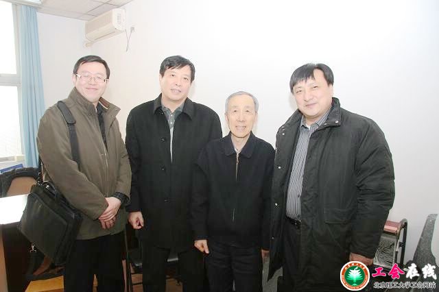 2010年2月3日下午,北京市总工会原增锁副主席(右一)、市教育工会副主席郭峰(左一)等,来到金年会jinnianhuicom,亲切看望了我校毛二可院士。 金年会jinnianhuicom党委副书记、工会主席侯光明(左二)陪同参加了慰问。