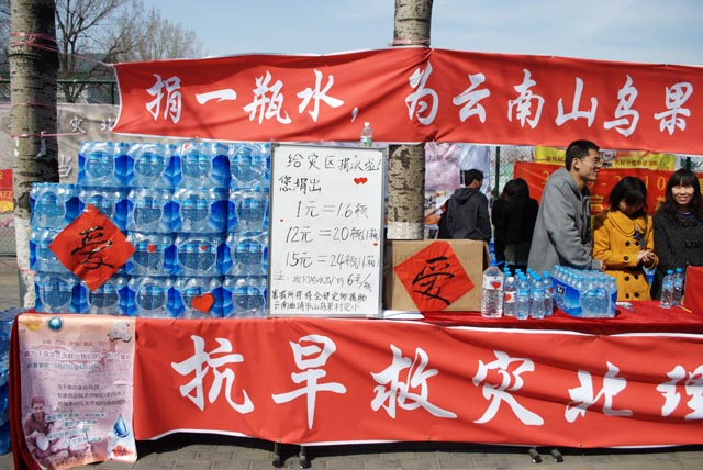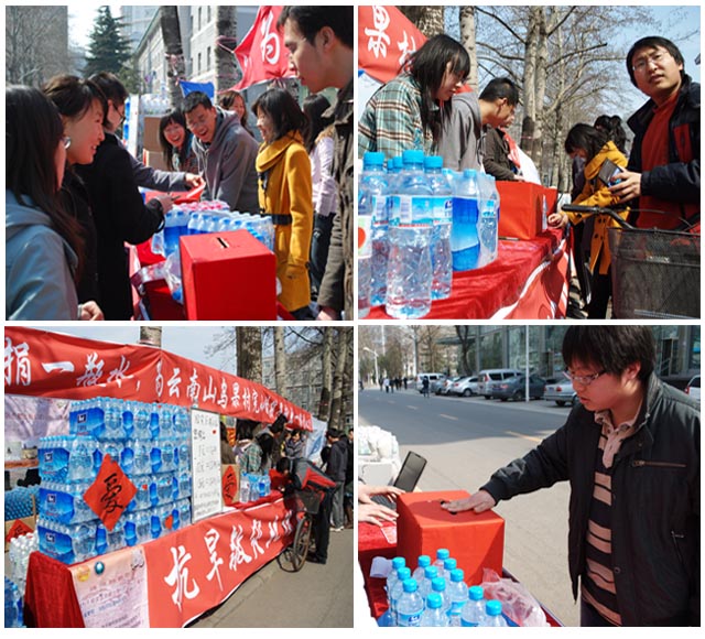 为响应团中央、全国少工委发出的“广大共青团员和少先队员积极投身抗旱救灾”的号召,3月27日上午10:00校团委、校研工委组织校研究生会、校学生会、校社团联合会在全校同学中发起了为期一周的“节水捐水 抗旱救灾”系列活动,为地处重灾区的云南省曲靖市师宗县葵山镇山乌果村完小(少数民族小学)定向捐水。截止3月27日19:00整,共收到捐赠的水款13927元。
