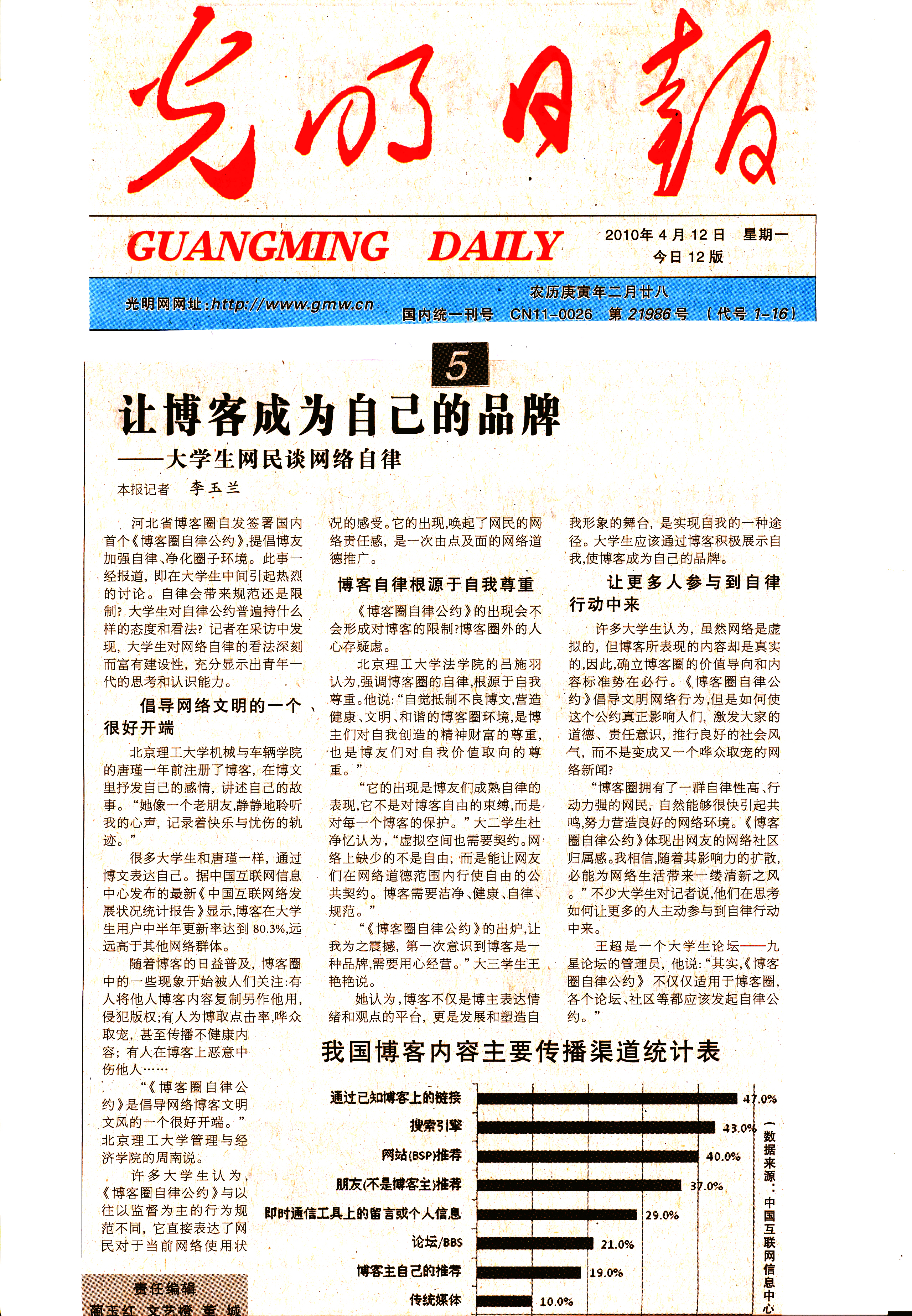 “《博客圈自律公约》的出炉,让我为之震撼,第一次意识到博客是一种品牌,需要用心经营。”大三学生王艳艳说。