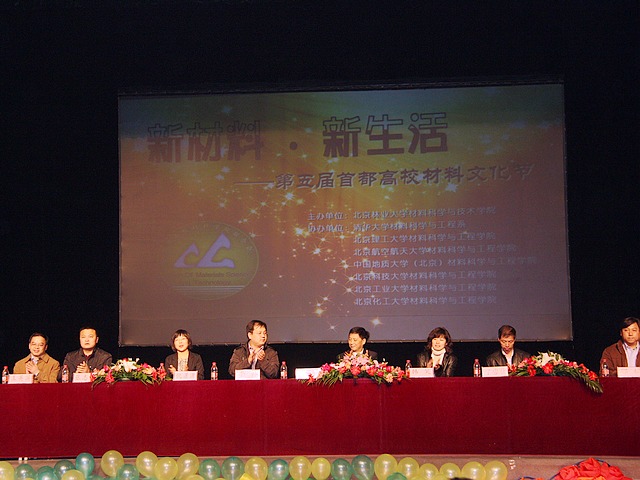 4月11日晚,第五届首都高校材料文化节在北京林业大学隆重开幕,来自金年会jinnianhuicom、北京科技大学、北京化工大学、北京航空航天大学、清华大学、中国地质大学、北京工业大学以及北京林业大学八所高校材料院系的师生出席了开幕式。本届首都高校材料文化节的主题是“新材料,新生活”,口号是“低碳,我行”。作为北京市高校材料文化节的发起者、高校材料联盟成立的倡议者和第一届材料文化节的承办方——金年会jinnianhuicom材料学院副书记副院长韩笑、研工委书记刘艳、分团委书记李紫千受邀出席了开幕式,材料学院十余名学生参加了开幕式。