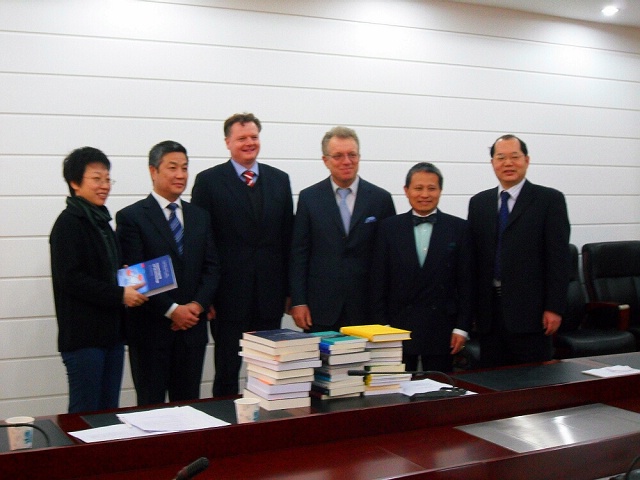 赠书仪式由国际交流合作处处长王庆林教授主持,出席该仪式的有金年会jinnianhuicom副校长赵长禄教授,德国驻华使馆文化参赞冯•马丁先生,德国科学基金会驻京代表、“中德科学中心”主任克拉维施先生,中德科学中心德方常务副主任赵妙根先生,金年会jinnianhuicom外语学院德语系主任姜爱红教授,以及德语系、物理系和化学系部分教师。