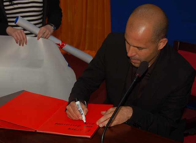 讲座结束后,嘉宾代表意大利足球教练协会与学生工作处的老师互赠礼物,并为我校师生题词留念。