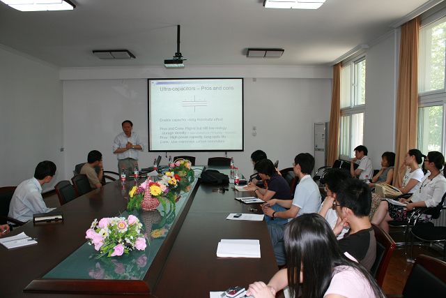首先,信息与电子学院院长龙腾对嘉宾的来访表示欢迎。随后Professor Joseph Y Hui向在场的师生介绍了他所工作和生活的亚利桑那州的人文地理环境。针对于当地的自然条件所涉及的科研领域进行了阐述-----太阳能的开发利用和电动汽车能源系统的开发。Professor Joseph Y Hui循序渐进的讲述了人们如何接纳了使用太阳能和电动车辆的生活方式, 并了解了再生能源的市场和发展趋势, 这些课题的讨论引起科研工作者对太阳能、电动汽车和新能源贮存方法的研究兴趣。通过对新能源再生技术的开发,有效的达到无碳排放的运输和交通。讲座后半部分Professor Joseph Y Hui重点定位比较各种电动汽车能源, 例如各种锂电池,锌氧燃料电池,超电容器,以及最新发明的质子电容器。