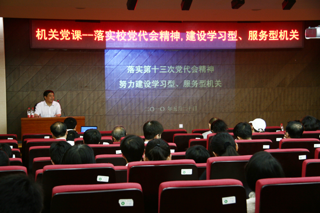 5月21日,校党委副书记侯光明在图书馆报告厅为机关党员讲了一堂题为《落实第十三次党代会精神 努力建设学习型、服务型机关》的党课,机关各党支部120余名党员参加,会议由机关党委书记杨惠萍主持。这是进一步深入宣传校第十三次党代会精神,在机关党委所辖各党支部率先开展争创学习型党组织活动的具体举措。