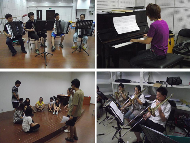 作为排练任务最重的分团,交响乐团和合唱团每天从上午到晚上都有排练任务,辛苦程度不言而喻。交响乐团弦乐声部的成员因为长时间排练,手指都已磨肿,而大管和双簧管的同学们反复排练,不辞辛苦,直到把嘴吹肿,却一句怨言也没有。合唱团的六十一位团员在中央音乐学院老师的专业指导用心排练,引吭高歌。一遍一遍的练习和声,他们的坚持与认真令人感动。