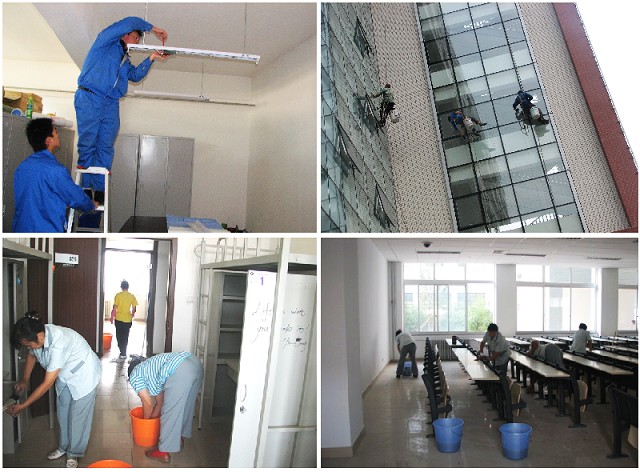 物业工作人员在检修灯管(左上)、擦洗楼宇外墙面(右上)、打扫学生宿舍(左下)、清洁学生教室(右下)