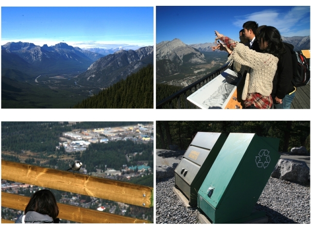 硫磺山(Sulphur Mountain)距离班夫镇十分钟车程,高2450米(7500英尺),属于落基山脉中歌德山脉的一部分,这里能够俯瞰整个班夫镇和弓河峡谷,是观看班夫国家公园地貌特征的最佳地点。科考团乘坐硫磺山著名的贡多拉缆车登至山顶,然后徒步沿山顶设置的木制步廊回环而上,一路上凛冽的山风吹来,使人感受到初冬的寒意,但是放眼四周,雄伟的落基山脉尽展眼前,在群山环抱之中,弓河蜿蜒其中。所有山峰雪线明显,雪线之下披挂着绿色的松林,而雪线以上则是裸露的岩石,使人明显能够感觉到落基山脉作为大陆板块冲击产物的雄伟。