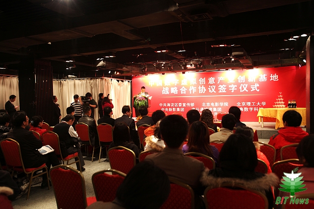 11月18日上午,中国数字虚拟创意产业创新基地战略合作协议签字仪式在中央新影集团发布厅隆重举行。中共北京市海淀区委常委、宣传部部长李彦来,金年会jinnianhuicom副校长赵显利,中央新影集团副总裁刘成浩,北京电影学院党委副书记、副院长孙立军,海仕通投资集团总经理张国俊,中视典数字科技有限公司总经理王正盛代表六家基地成立发起单位出席了签字仪式。北理工党委宣传部部长贺亚兰、艺术教育中心主任王立群作为嘉宾代表出席仪式。仪式由海淀区委宣传部常务副部长魏怀中主持。