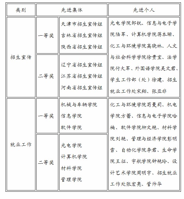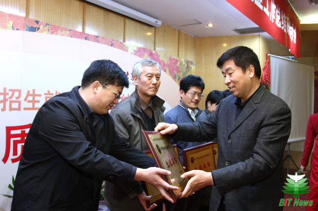 为进一步规范招生就业工作,完善招生就业指导服务体系,提高招生就业工作水平,学校于2010年10月启动了招生就业工作评估工作。经过各学院自评、专家评审、现场答辩等各个环节,最终评选出招生宣传工作先进集体6个:其中一等奖3个,分别为天津市招生宣传组(信息与电子学院),吉林省招生宣传组(理学院),陕西省招生宣传组(计算机学院);二等奖3个,分别为辽宁省招生宣传组(材料学院),江苏省招生宣传组(生命学院),河南省招生宣传组(外语学院)。评选出招生宣传先进个人10名。评选出就业工作先进集体7个,其中一等奖3个,分别为机械与车辆学院、信息与电子学院、软件学院;二等奖4个,分别为光电学院、计算机学院、材料学院、管理与经济学院。评选出就业工作先进个人12名。郭大成书记,杨宾副校长,赵平副校长、纪委书记杨蜀康为招生就业工作先进集体和个人颁发了奖牌、荣誉证书和奖品。