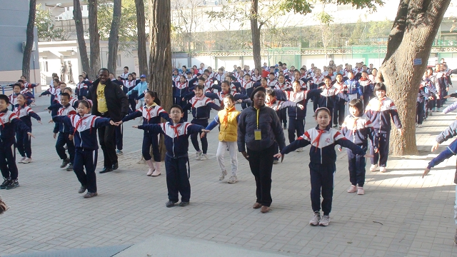 代表团访问期间适逢附小课间操,校长们看到小学生规整的队伍和整齐的动作,兴奋异常,征得校长允许后,纷纷加入校学生的队列学着做操。校长们还在后续的学生游戏环节跟小朋友们一起互动,气氛十分热烈。忙着做操、做游戏、照相的代表们直到课间操结束仍意犹未尽。甚至有两位校长随着班级队列一路跟进了小学生们的教室。