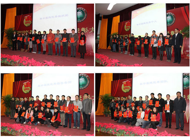 大会对2010年的暑期社会实践活动进行了全面的表彰。其中,杨震、张蕊等52名同学荣获优秀个人,张磊、章涛等20位教师荣获优秀指导教师,设计与艺术学院赤水实践团、走访百名校友实践团等26支团队分获团队一、二、三等奖及优秀奖,宇航学院、机电学院等12个单位荣获优秀组织奖,此外还对工信部家电下乡优秀调研报告获奖同学进行了表彰。