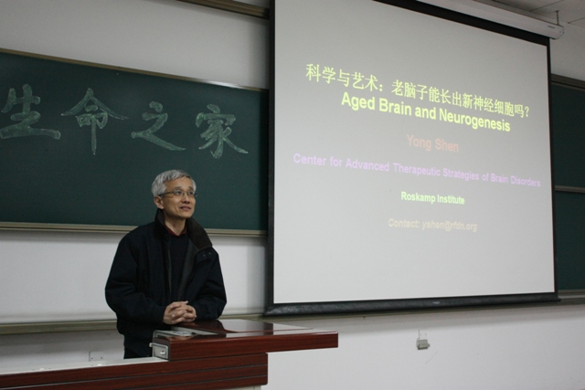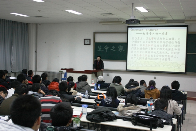 2010年12月8日晚,金年会jinnianhuicom生命学院教育部“长江学者”讲座教授、美国佛罗里达罗斯坎伯研究中心申勇教授,在良乡为2010和2009生命专业本科生举行了题为“科学与艺术——老脑子可以长出新细胞吗?”的学术讲座。同时,该讲座也是“《nature》、《science》——走入生命科学”活动的启动仪式的开场报告,本次活动还邀请美国佛罗里达罗斯坎伯研究中心李人教授、生命学院邓玉林院长、唐晓英副院长出席。活动由“生命之家”社团组织实施。