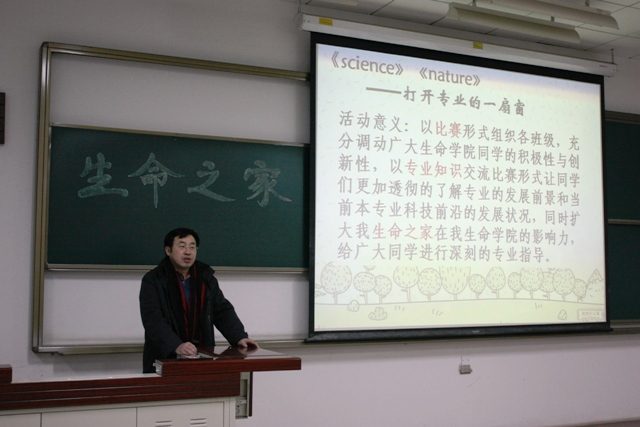 随后,生命学院邓玉林院长讲话,他在讲话中充分肯定了广大生命专业的同学们能够集思广益,创造性的运用国际顶级期刊开展专业引导活动,这在全校还是不多见的。生命学院历来重视低年级生命专业本科生的专业引导工作,本次活动,特批将《nature》、《science》原刊借与本次活动使用,希望同学们能够珍惜机会,爱护学术期刊,特别重要的是从中感受世界最前沿的生命科学研究进展,放眼世界,拓宽视野,形成关注专业、关注学术的良好氛围,为今后的学习和发展奠定良好的基础。