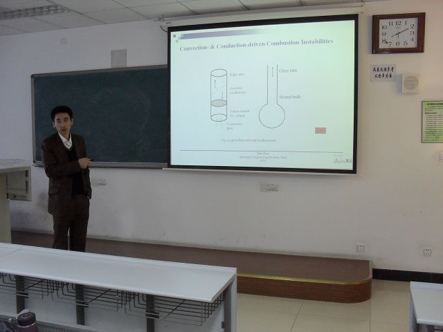 赵丹,博士,副教授,于2005年在曼彻斯特大学获得硕士学位,2009年在剑桥大学获得博士学位,2010年任教于新加坡南洋理工大学宇航系,研究领域包括不稳定燃烧的主动和被动控制、流动噪声测量和控制、声学成像、声学阻尼器以及信号处理等。赵丹副教授在报告会上介绍了他在不稳定燃烧主动与被动控制领域的研究工作及成果应用,同时还介绍了在研的“热声生电”理论基础以及该研究工作的应用前景。赵丹副教授的报告引起了到场师生很大的兴趣,与会师生进行了热烈的讨论。