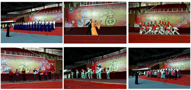 由郭景华老师带领的太极拳协会带来武术表演《拳功组合》,春韵诗词笔会的四位老同志朗诵温总理的诗词作品《仰望星空》,和自编自导的《三句半》,令人印象深刻。