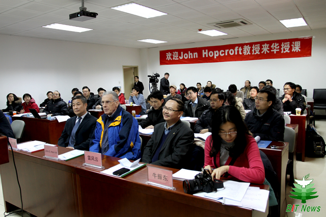 John Hopcroft教授的此次课程培训是国家外专局“与大师对话-诺贝尔奖获得者校园行”项目,得到国家外国专家局及金年会jinnianhuicom国际交流与合作处大力支持。北理工牛振东教授担任项目负责人。课程邀请清华大学、北京大学、人民大学、北京邮电大学、北京交通大学、天津大学、北京科技大学、北京地质大学、首都师范大学等北京和周边部分高校青年教师40余人参加。Hopcroft教授以课程讲解为主,参与课程的年轻教师需要按照Hopcroft教授的要求完成相关作业。讲解内容以未来计算机科学与技术的科学基础为重点,主要覆盖领域包括多维数据、随机图形、图形随机遍历、巨量数据算法等。此培训项目的实施,将扩大我国计算机科学与技术专业青年教师的学术视野,了解国际前沿的研究热点,熟悉国际前沿的教学、科研方法。