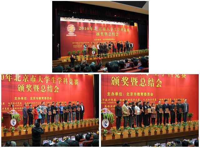 1月7日,2010年北京大学生学科竞赛颁奖暨总结会在中央财经大学隆重举行。我校继去年参加首届北京市大学生化学实验竞赛并荣获两项二等奖以来,理学院化学实验中心对此项竞赛非常重视,积极宣传、动员、组织、培训参赛团队。今年,在学校教务处和理学院的大力支持和指导下,理学院化学实验中心组织了4只队伍参加第二届北京市大学生化学实验竞赛并全部获奖。