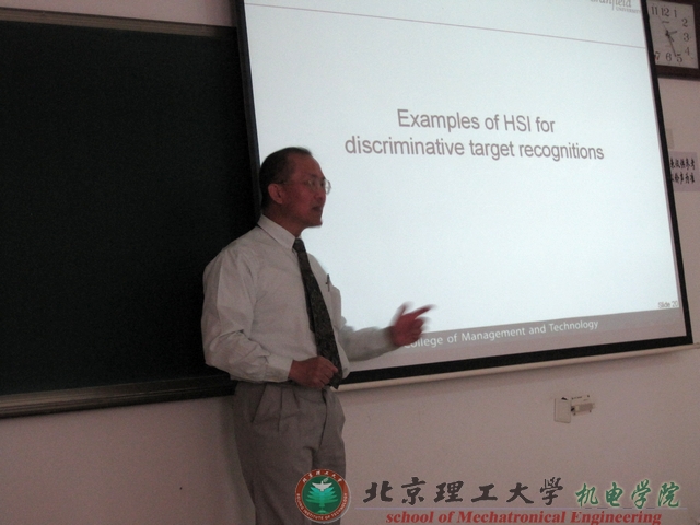 Yuen教授首先用丰富详实的实例介绍了超光谱技术的广泛应用情况,特别介绍了这一技术在医学、反恐以及军事上的应用,重点讲解了超光谱领域一些关键技术问题。报告会上,Peter与参会的师生进行了深入交流,回答了参会同学提出的问题并畅谈了自己对一些技术问题的理解。最后李杰老师代表机电系无人系统与测控课题组向Yuen教授赠送了北京奥运、上海世博邮票纪念品,希望未来能有更深入的合作与交流。Peter表示作为华人真心希望中国成为技术强国,他也愿意在教师互访以及学生互换方面逐步开展工作,交流技术。