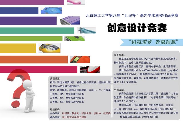此次大学生创意设计作品分赛是在原有的“世纪杯”基础上新开设的赛区,主题为“进步科技,无限创意”,目的在于丰富“世纪杯”参赛项目,鼓励更多有创意的同学参与科技作品竞赛中来,推动我校学生课外学术科技活动的蓬勃开展,培养具有学习能力、实践能力和创新能力的高素质人才。
