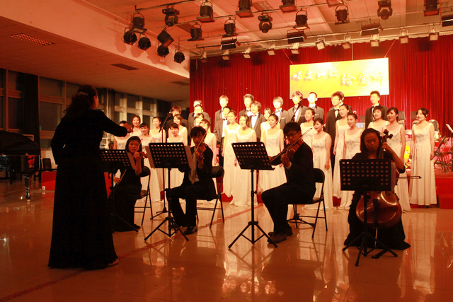 这是5月29日晚7:00在中关村校区新食堂四楼多功能厅举行的“唱支山歌给党听”——交响合唱室内主题音乐会现场传出的声音。该主题音乐会是我校“青春同行 党旗生辉”共青团系统纪念建党九十周年主题教育系列活动之一,由校团委、艺术教育中心主办,校大学生艺术团交响乐团、合唱团承办,校大学生艺术团手风琴团、钢琴团协办。音乐会在催人奋进的交响序曲《红旗颂》的旋律中拉开序幕。