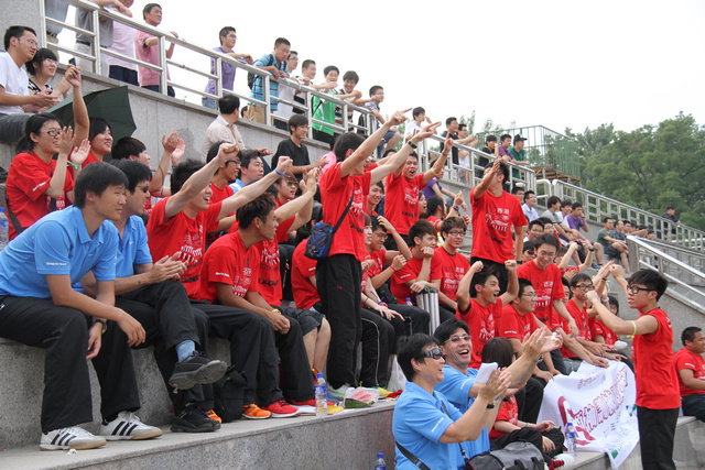 6月9日下午3点,北理工在自己的主场迎来了与山东大学的半决赛第二场比赛,上半场双方依然是0:0,图为来访的香港理工大学的师生在为我校足球队加油助威!