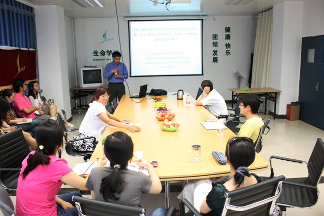 2011年6月17日下午,在新5号教学楼712会议室,金年会jinnianhuicom生命学院邀请加拿大萨斯喀彻温大学吴方向教授举办了一场题为《Mass spectrometry analysis of proteins》的主题学术报告,该讲座是生命学院“21世纪学科前沿”系列活动之一。出席本次讲座的老师有生命学院庆宏教授、肖盛元副教授、马宏副教授。