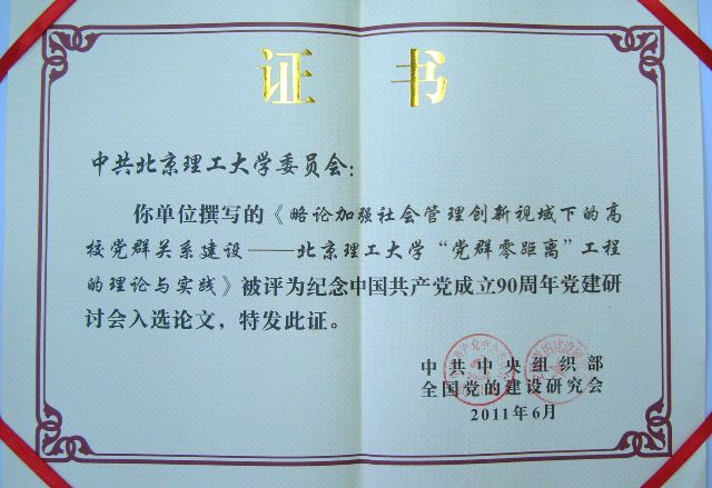 北理工论文被评为纪念中国共产党90周年党建研讨会入选论文